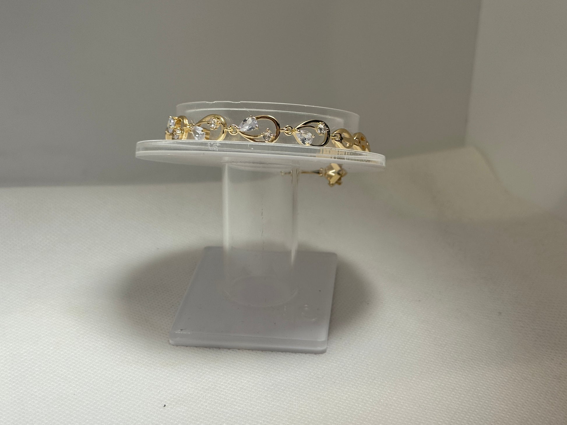 it is a gold plating bracelet with a design oval and inside is looks a little rose of color pink red, resistant material. we have in two color.